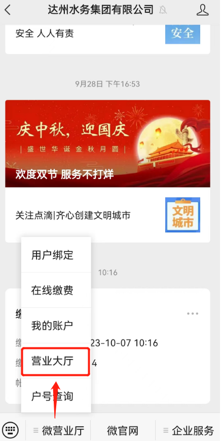 首先進(jìn)入達(dá)州水務(wù)集團(tuán)有限公司微信公眾號(hào),點(diǎn)擊微營業(yè)廳-營業(yè)大廳,進(jìn)入營業(yè)大廳界面。