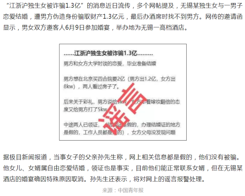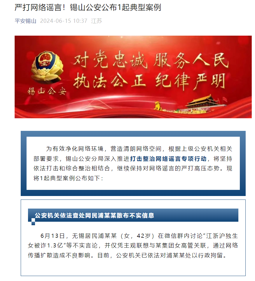 6月15日,江蘇無(wú)錫市公安局錫山分局發(fā)布通報(bào)稱,無(wú)錫居民浦某某(女,42歲)13日在微信群內(nèi)討論“江浙滬獨(dú)生女被詐1.3億”等不實(shí)言論,并僅憑主觀聯(lián)想,與某集團(tuán)女高管關(guān)聯(lián),通過(guò)網(wǎng)絡(luò)傳播擴(kuò)散造成不良影響。目前,公安機(jī)關(guān)已依法對(duì)浦某某處以行政拘留。