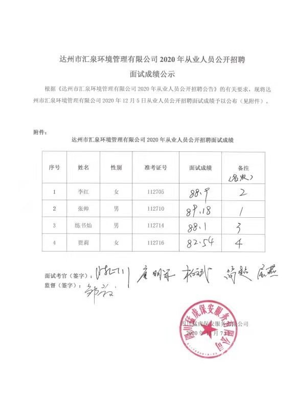 標(biāo)題:達州市匯泉環(huán)境管理有限公司2020年從業(yè)人員公開招聘面試成績公示